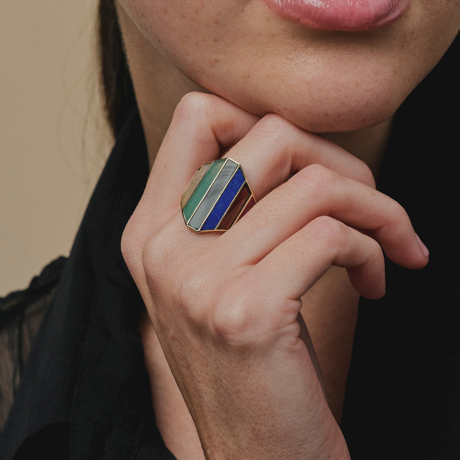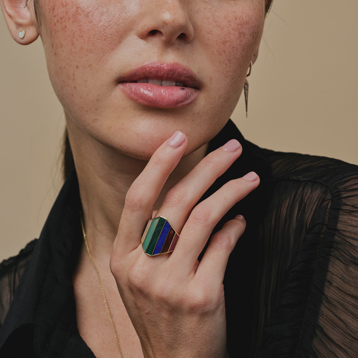Hoop earring with multiple plaque add ons in gold and emerald by Metier