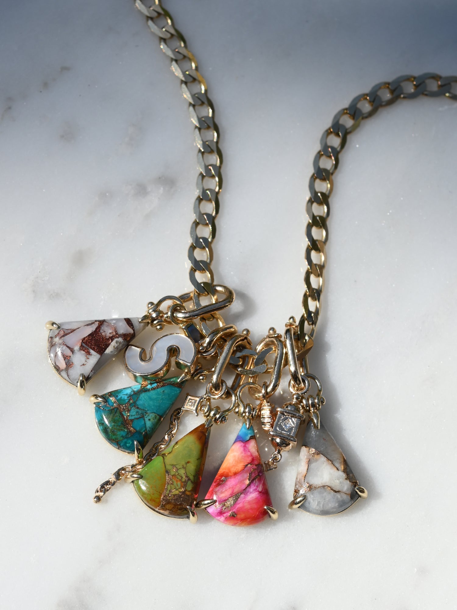 OJO, meaning "eye" and embodying vigilance, graces these exquisite, unique stone composites, each carrying its own distinct meaning. Offered in two sizes, these plaques seamlessly fit our clickers, chains, and bracelets.